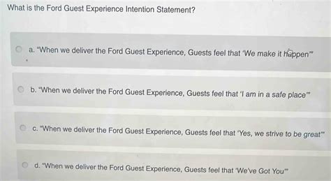 The guest experience intention statement is the culmination of extensive research and analysis from Ford's customer service team, who have been working to identify the key drivers of customer satisfaction. The statement is designed to be a roadmap for the company's guest experience strategy, helping them to identify areas of improvement and prioritize initiatives that will have the most significant impact on their customers.